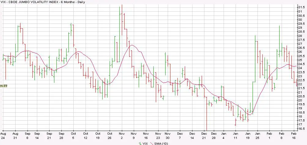 February VIX options expired today. The settlement price (ticker VRO/$VRO/^VRO) was 22.50. The VIX index opened at 22.25. With this settlement price I ended up losing .35 per call on my VIX spread. Things could have been much worse–I could have lost up to 2.85 with the spread. I certainly didn’t expect the VIX to stay up at the levels it has. People always seem surprised at how fast things drop in a correction, that coupled with the recent savage bear market, and the uncertainty in the EU, has people spooked. The 6 month pattern of VIX dropping rapidly after upticks was broken with this sequence. I’m reminded of the quote, “everything works sometimes but nothing works all the time”.
