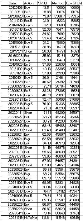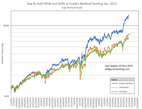 But I kept rerunning the back test as more data became available, and the same parameter values were always chosen. I was fully invested in a number of ETFs, including SPHB, when the market began to decline early in 2025. The SPHB method gave a 100% sell signal on Feb. 28, so I sold just about all of my holdings at that point, deciding to purchase mostly SPHB at its next buy signal, which came on April 11. The method is still using the same parameter values that it selected more than 2 years ago. SPHB has gained nearly 40% since the April 11, 2025 buy. Unless stated otherwise, my positions will match the current status indicated at the beginning of the post.